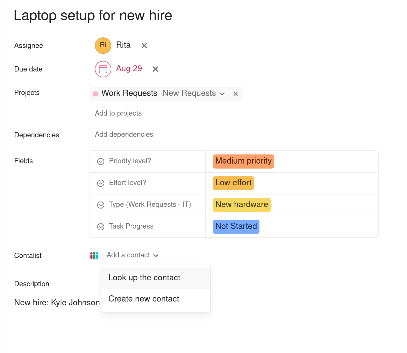 Click the contact in the dropdown list to select it and it will be added to your task. Congrats! It's done.